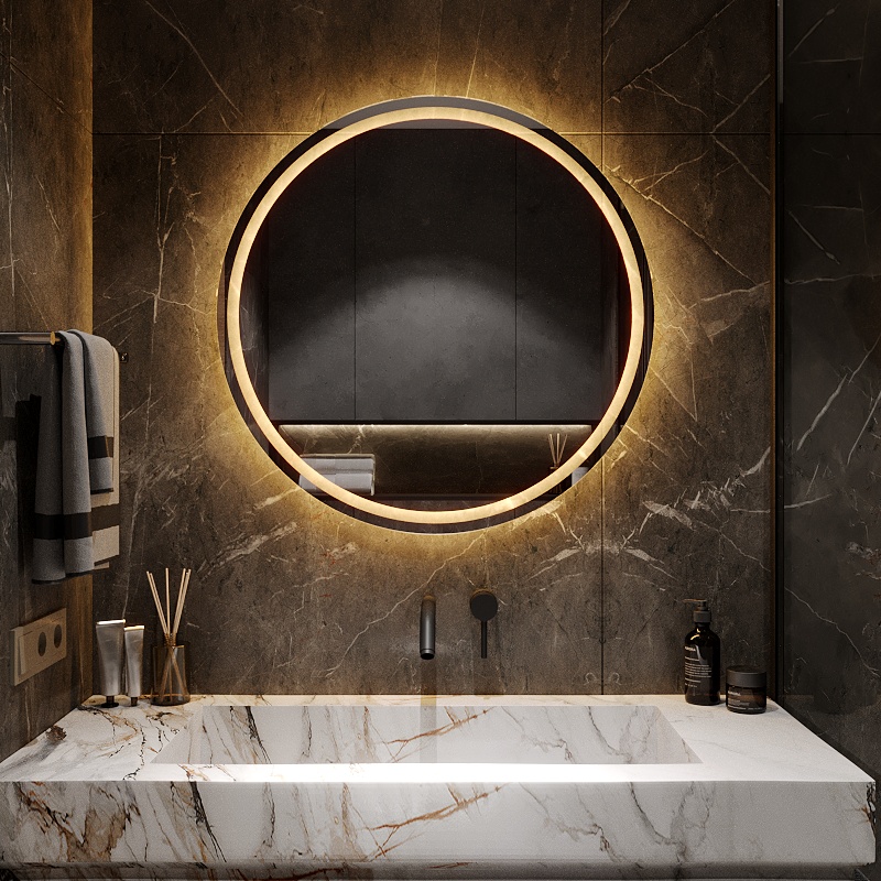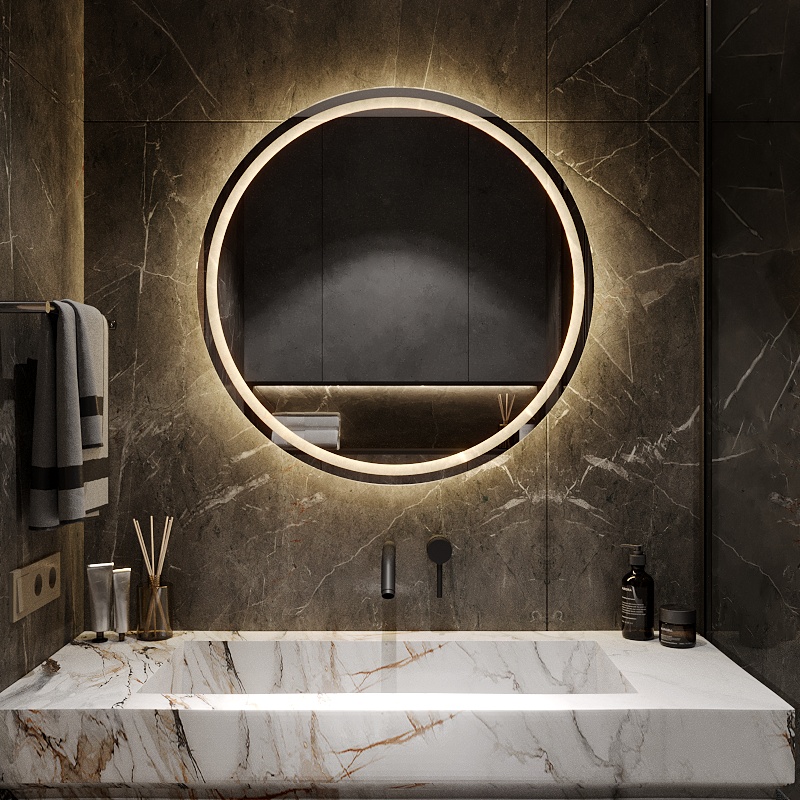 Oglindă elegantă cu un design modern: lumina trece delicat prin conturul sablat și se reflectă pe perete, creând un accent luminos deosebit. O alegere perfectă pentru interioarele stilate.